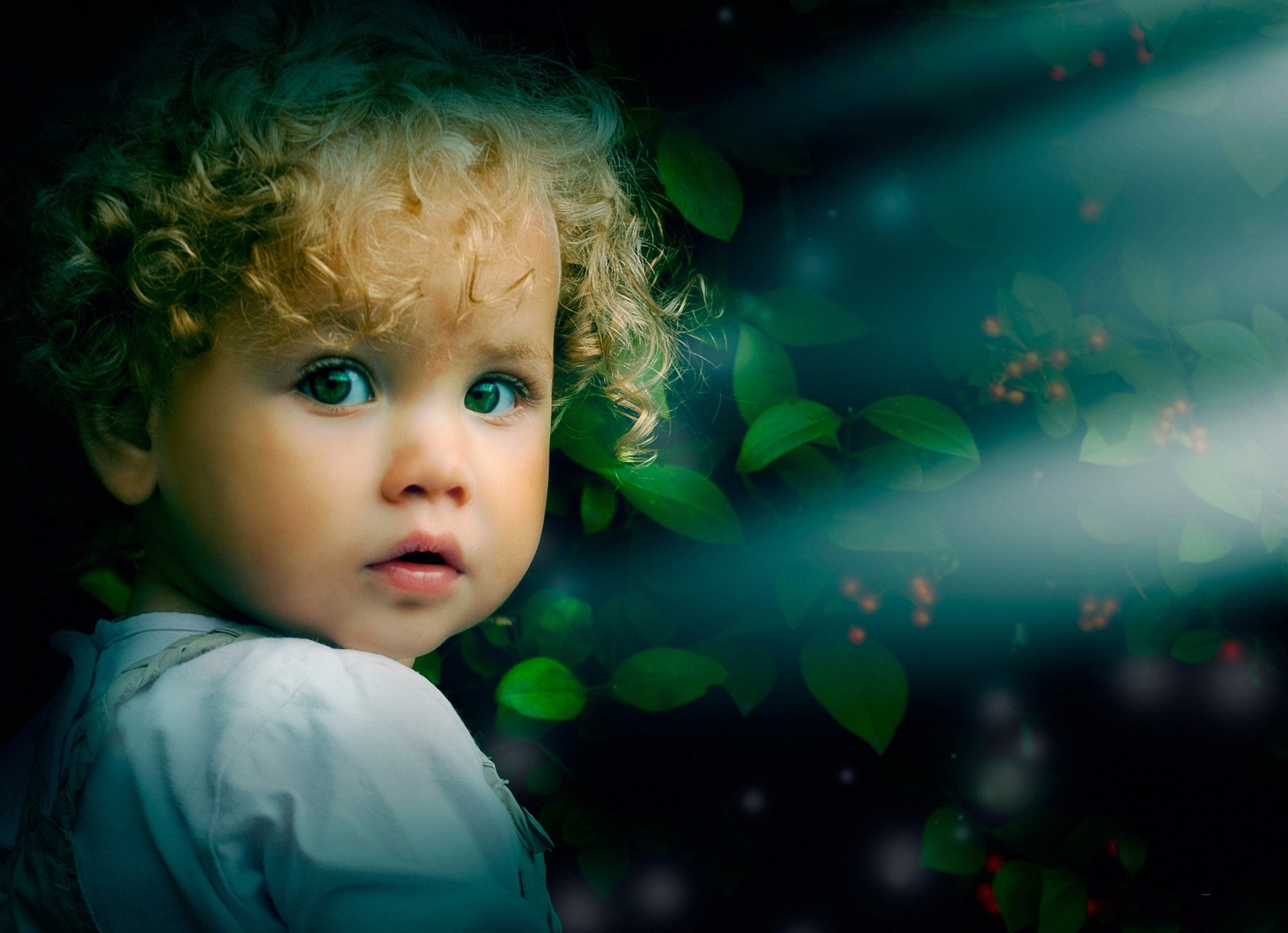 Blonde baby on a background of green petals