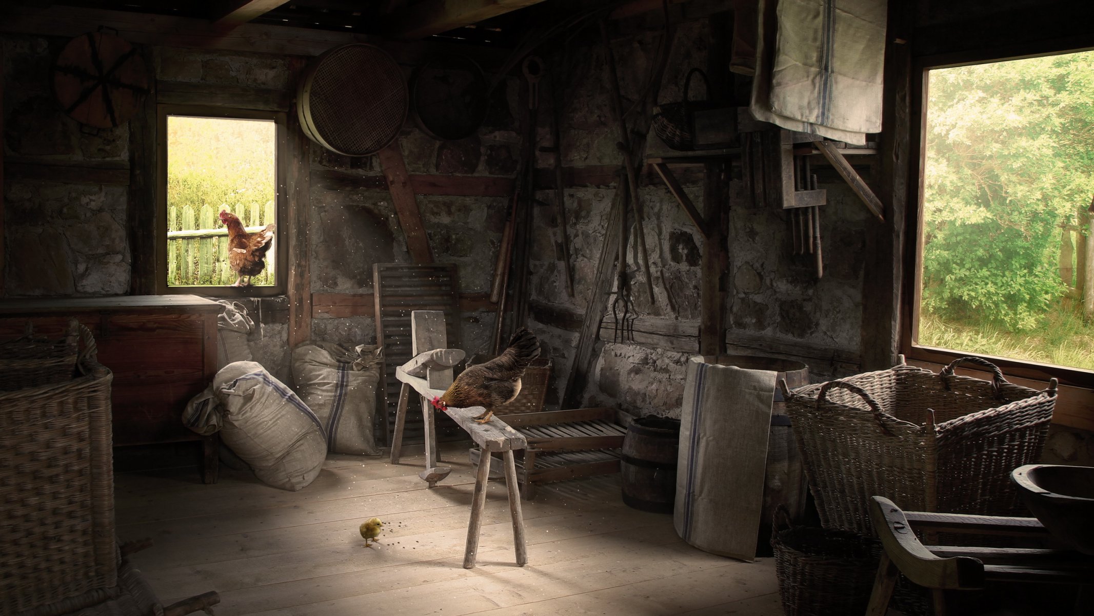 A rustic barn with chickens and all sorts of utensils