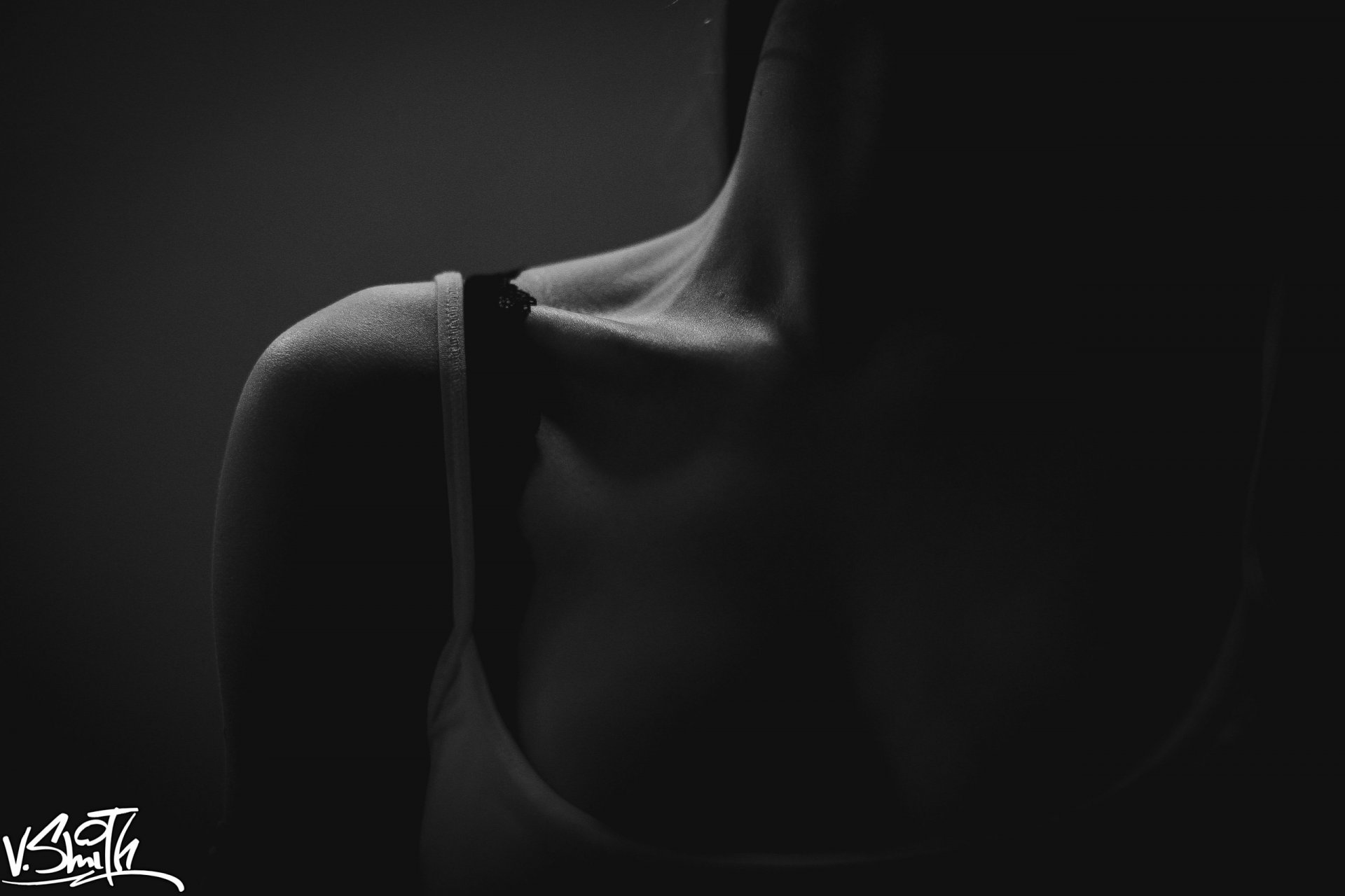 Female collarbone in a white T-shirt on a dark gray background