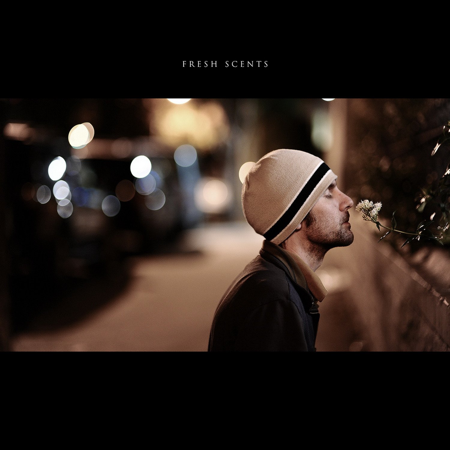 A man on the street sniffs a flower