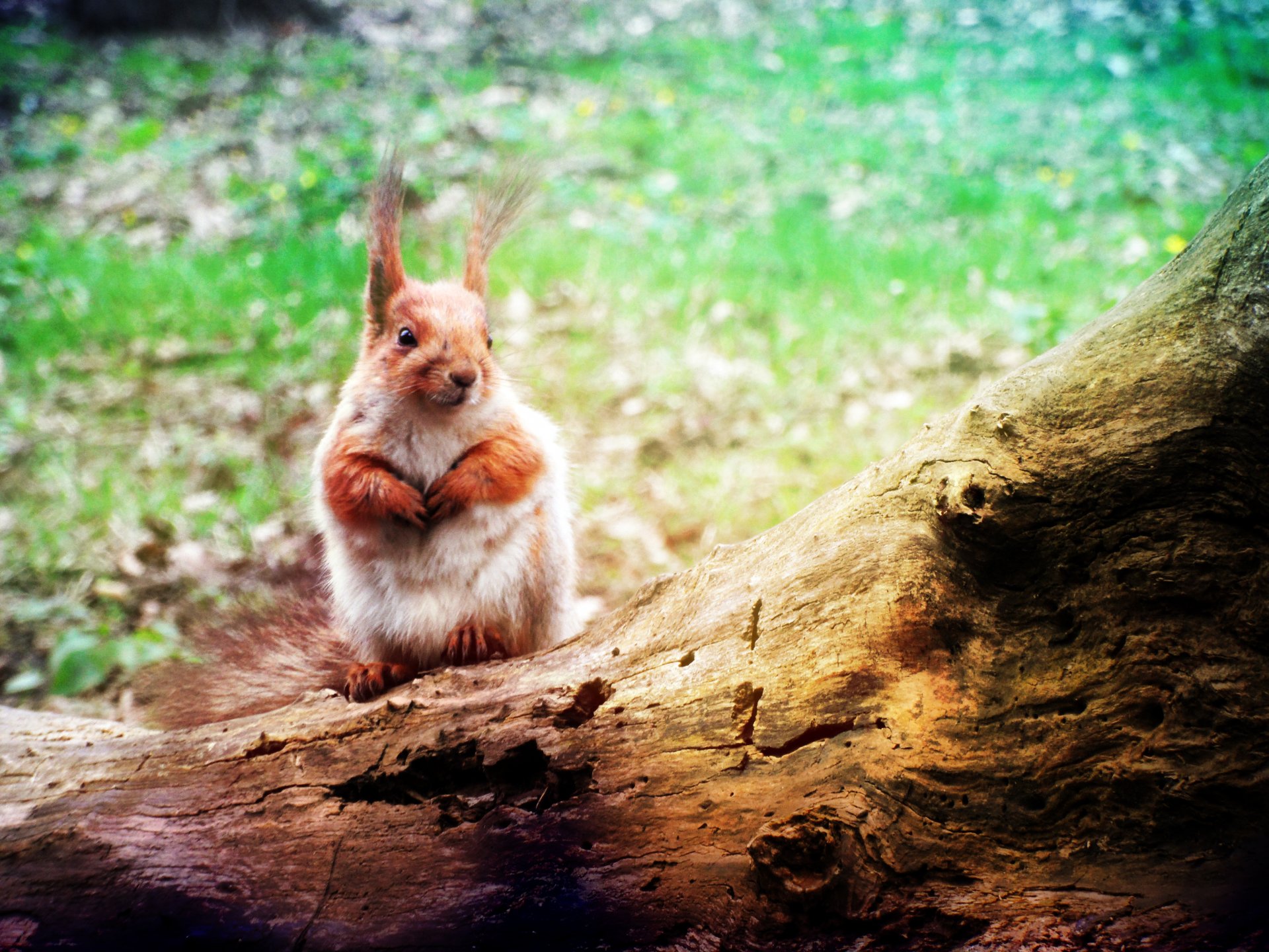 A small fluffy squirrel is sitting on a fallen tree