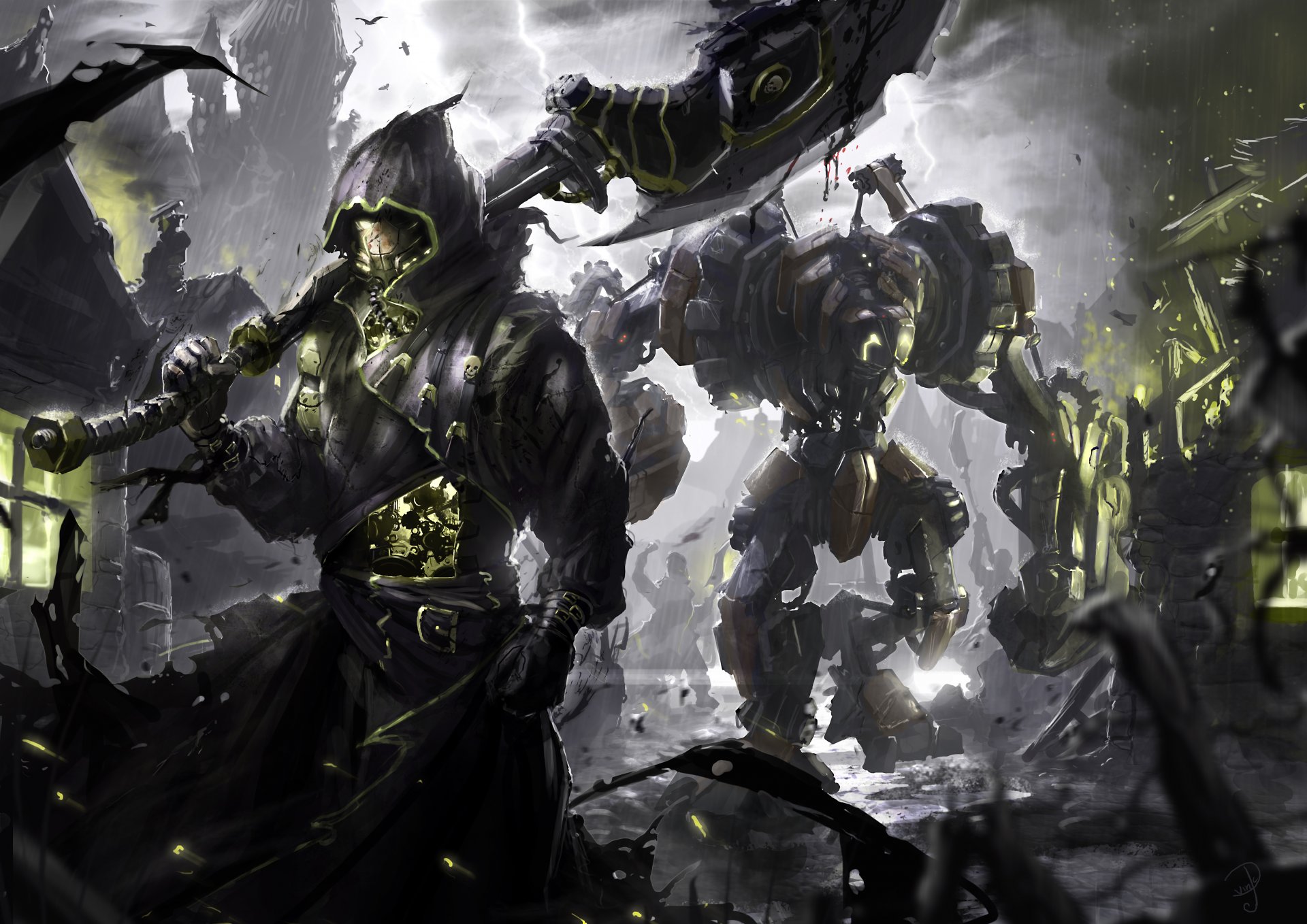 Image tags:warrior, axe, coat, hood, robots, night, rain, village, house, window, castle, sky, lightning, volatile, mouse