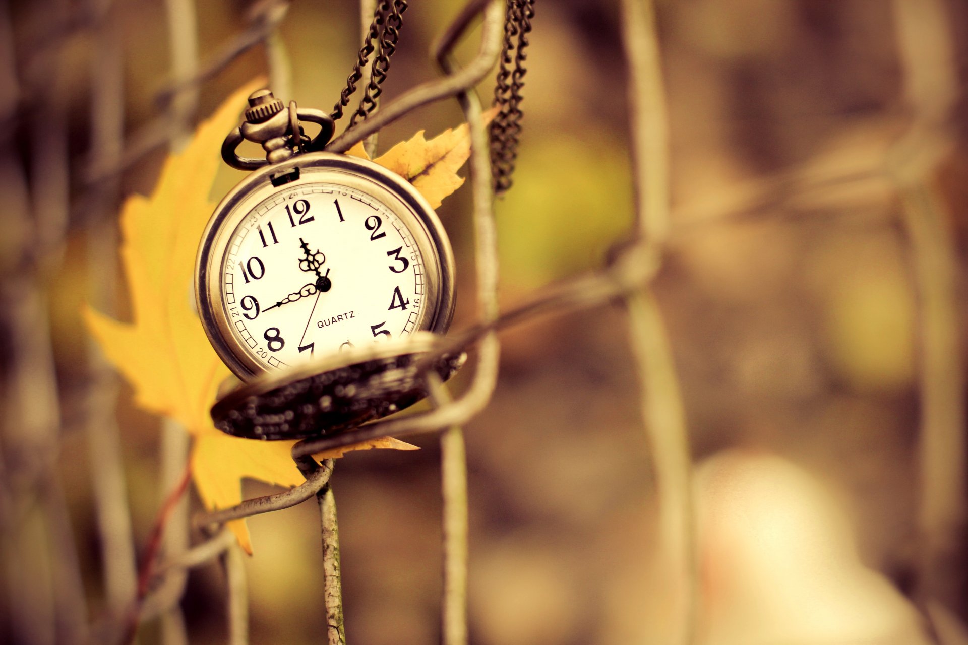 Image tags:watches, suspension, face, of the arrow, time, fence, net, sheet, yellow, autumn, close up, nature