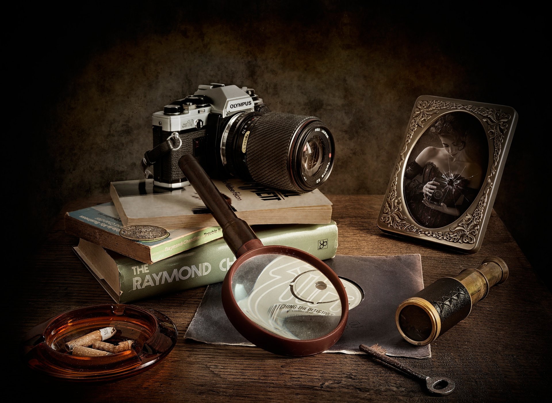 Image tags:watching the detectives, camera, magnifier, books, detectives, portrait