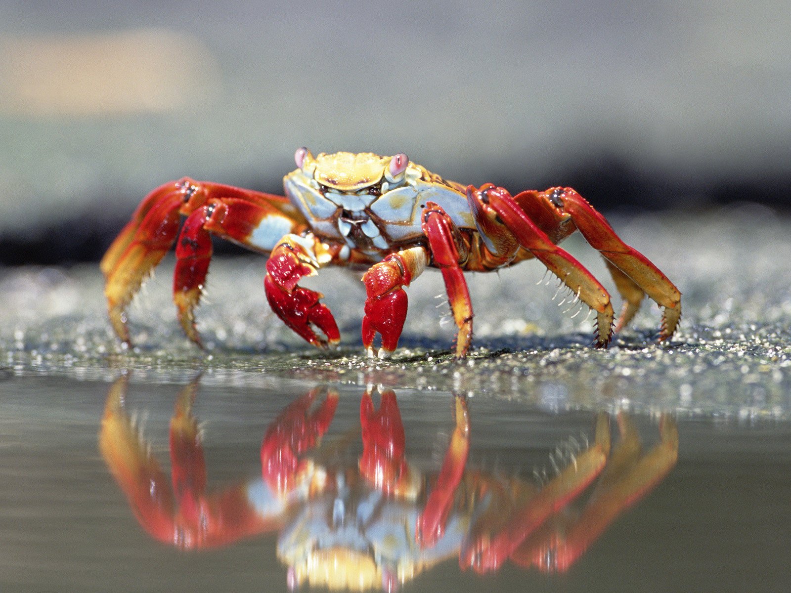 The crab looks at his reflection