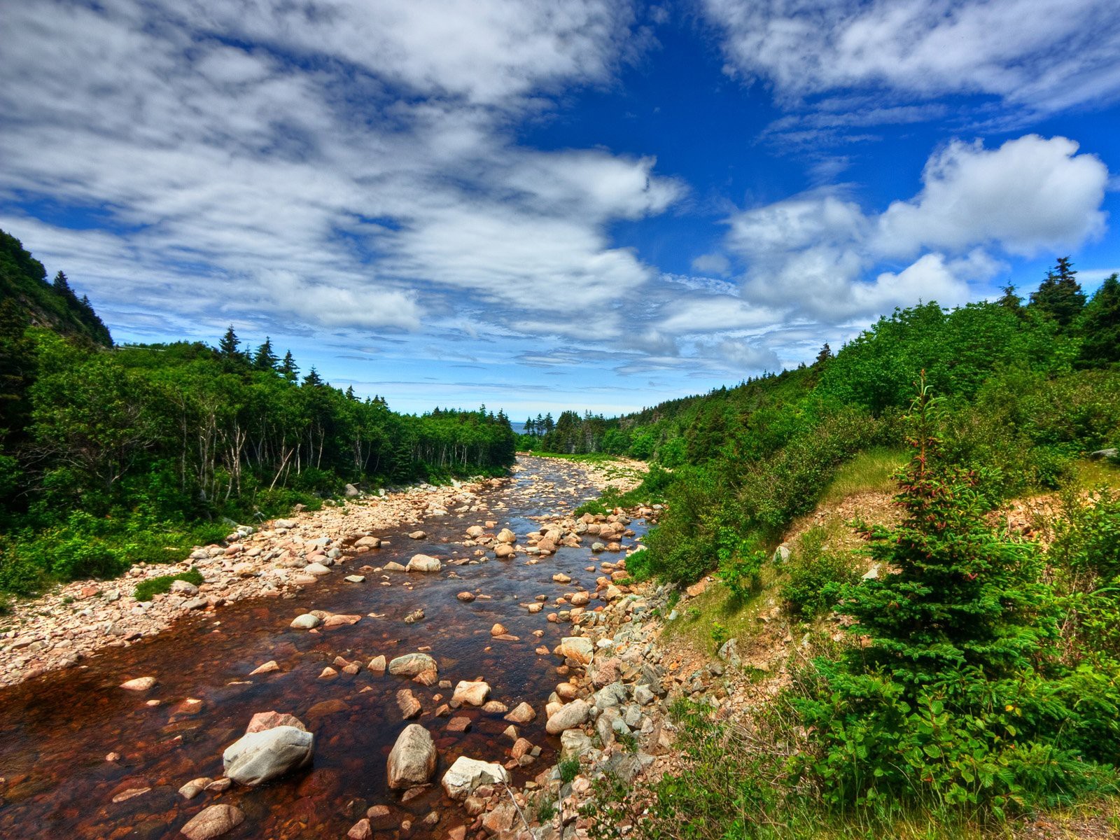 A mountain stream passing between woodlands