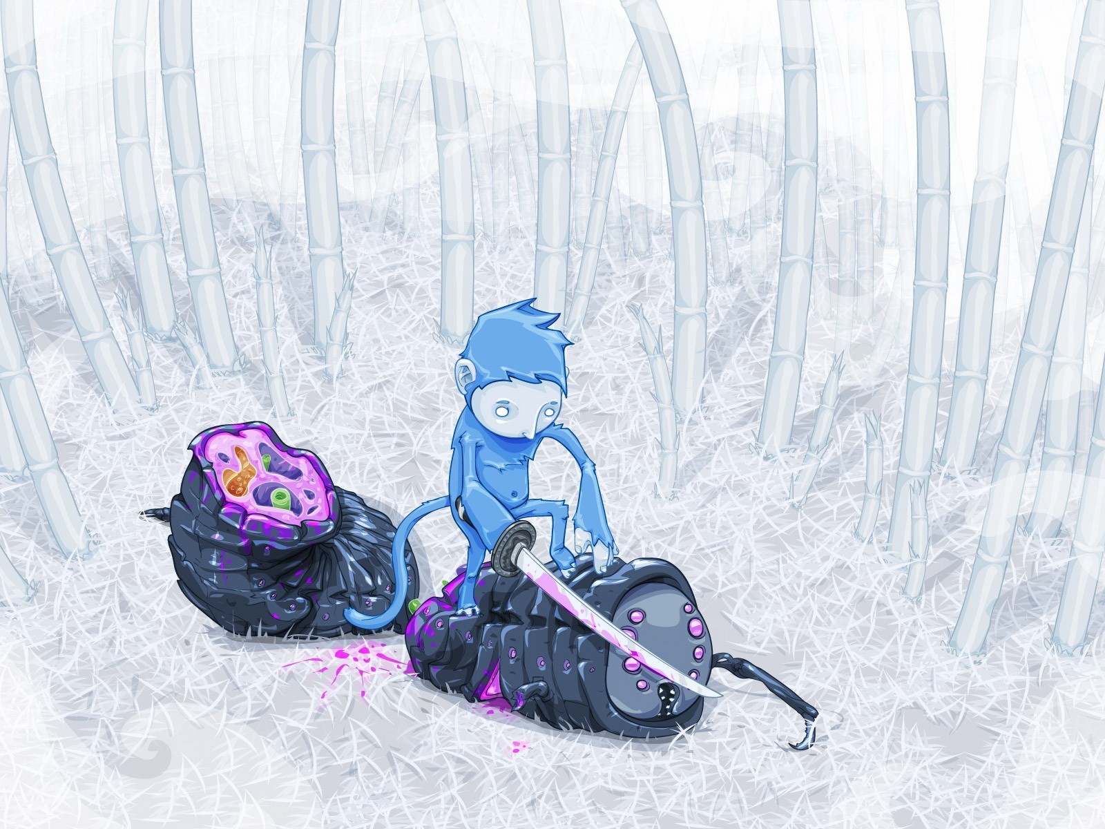 The monkey cut the monster with a white sword