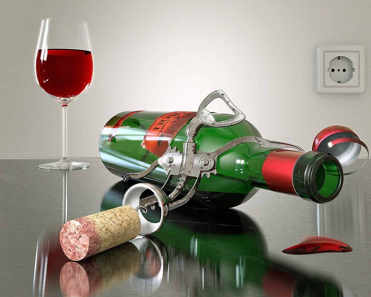An empty bottle is lying next to a glass of wine