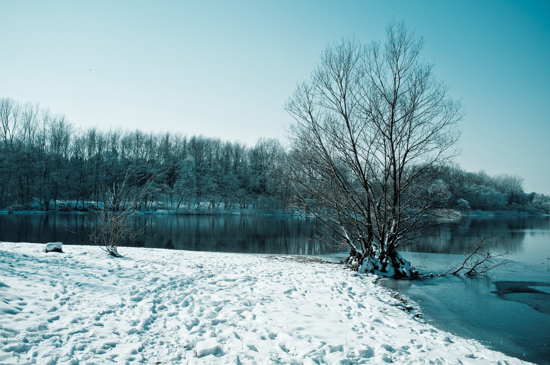 Winter lake with trees in time for snow