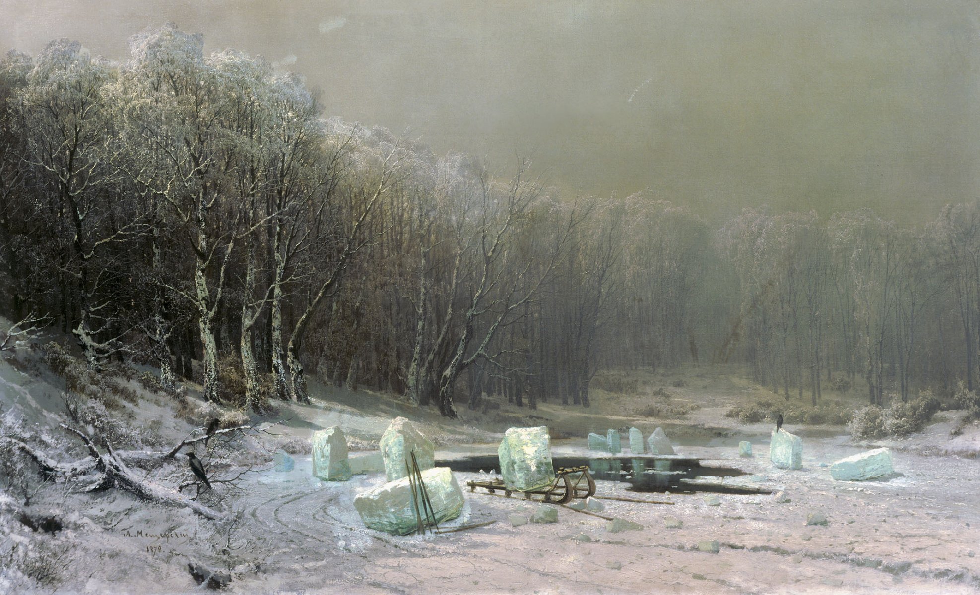 An ice hole abandoned by ice axes on a gloomy day