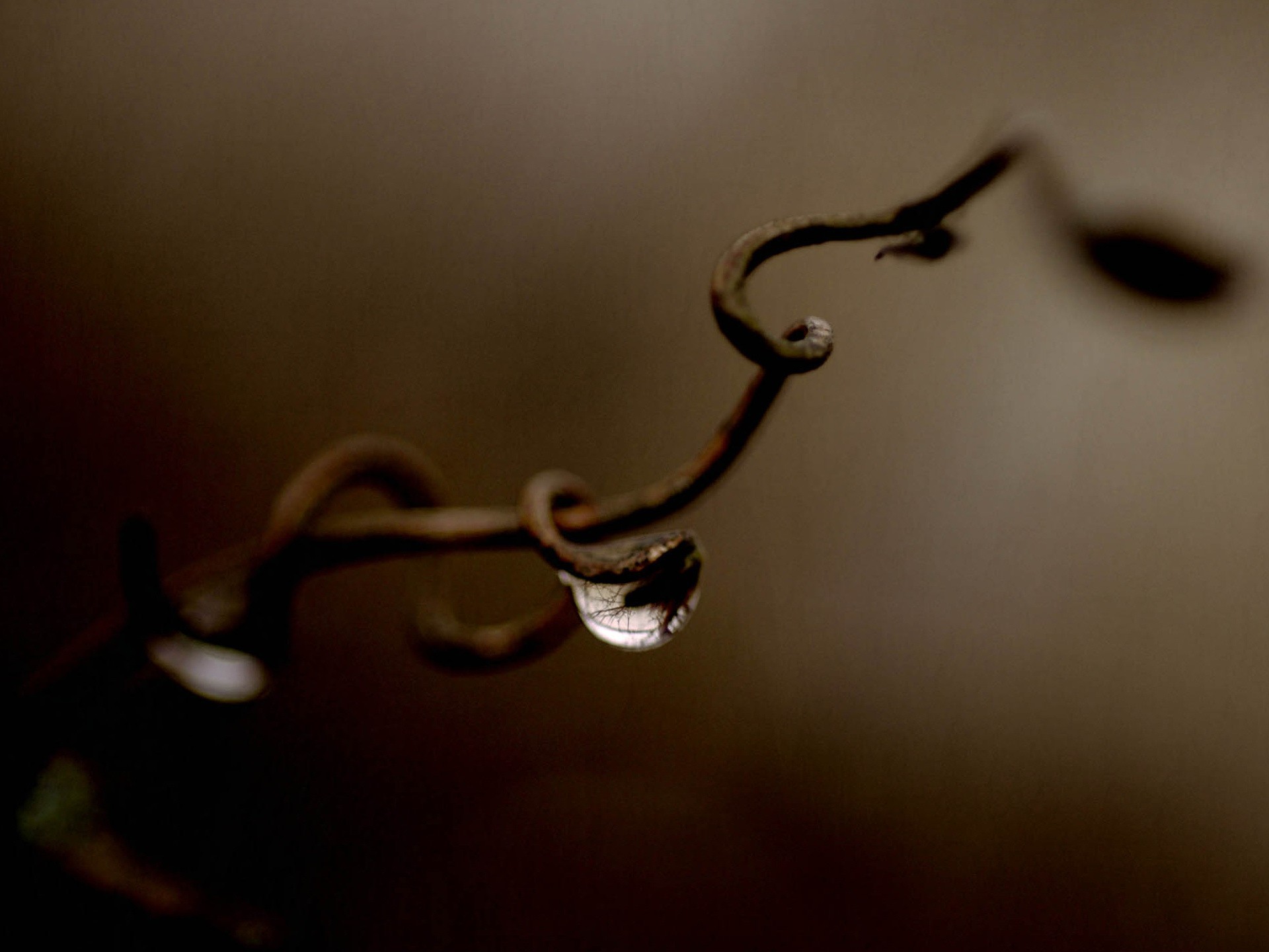 Dried grape tendril in a beautiful curve spiral with a dewdrop