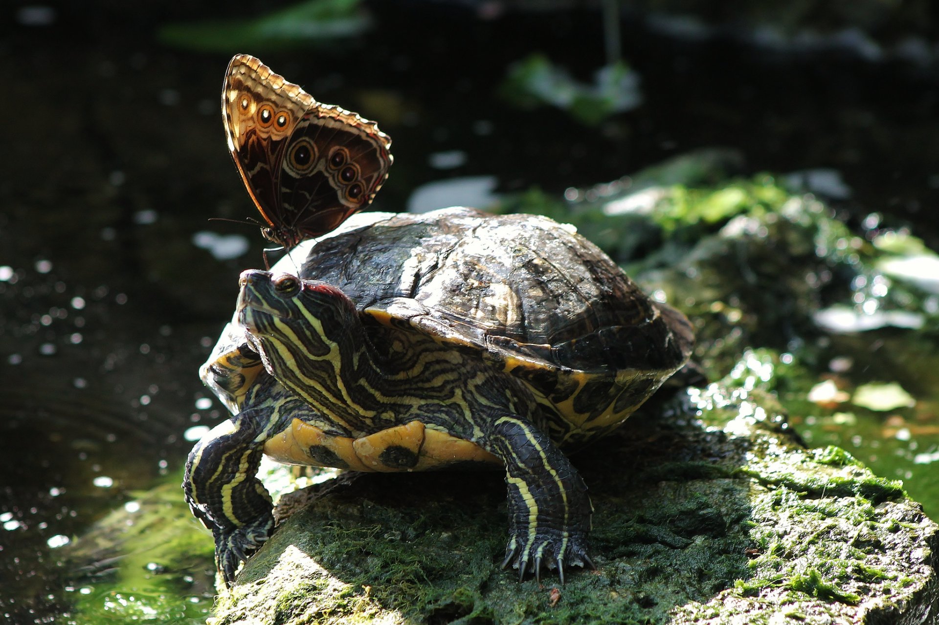 A butterfly perched on a red-eared turtle