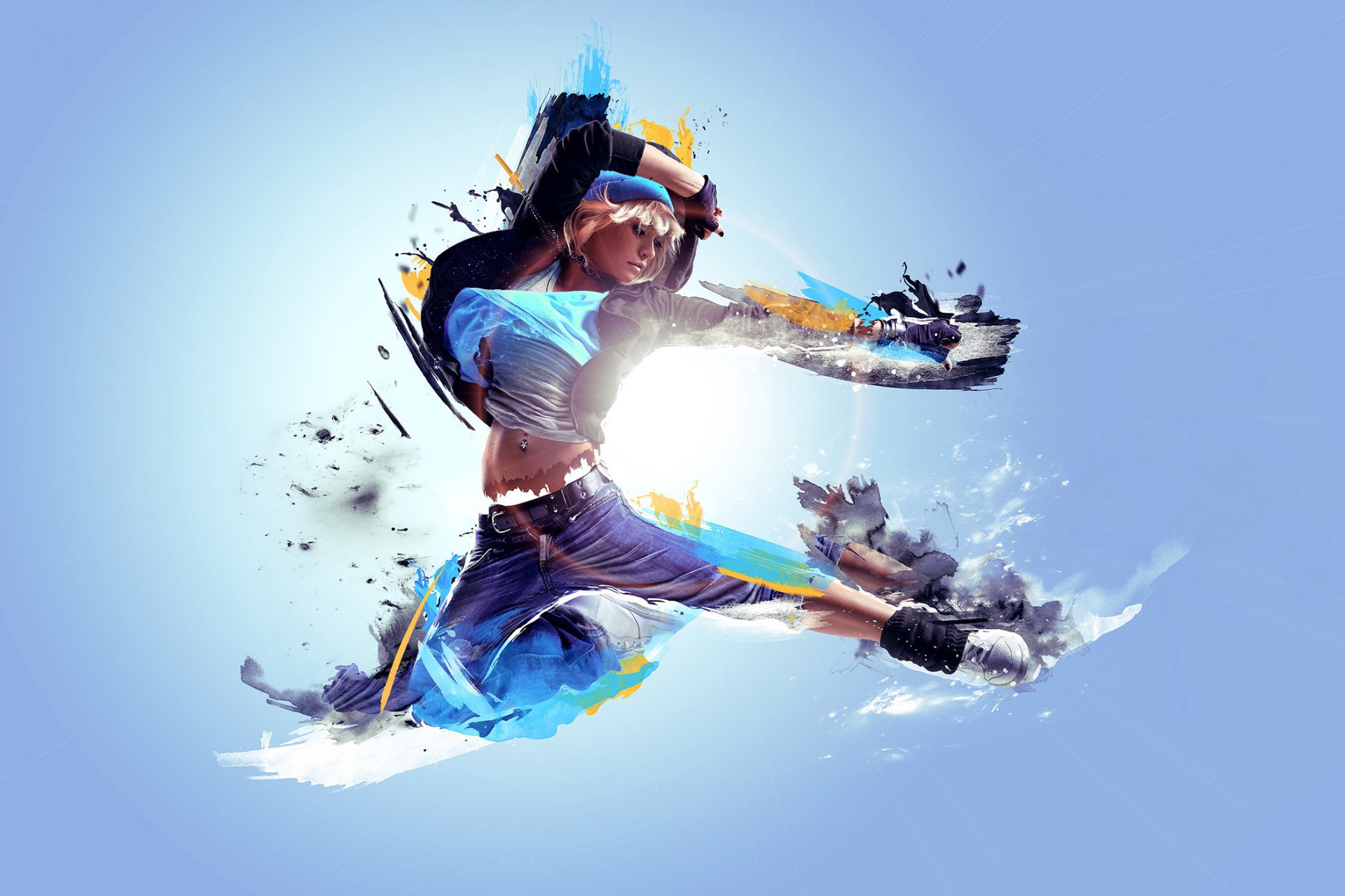 Image tags:woman, blonde, athletic, dancing, flying, model, abstract, lights, blur, parkour, white, black, blue, yellow