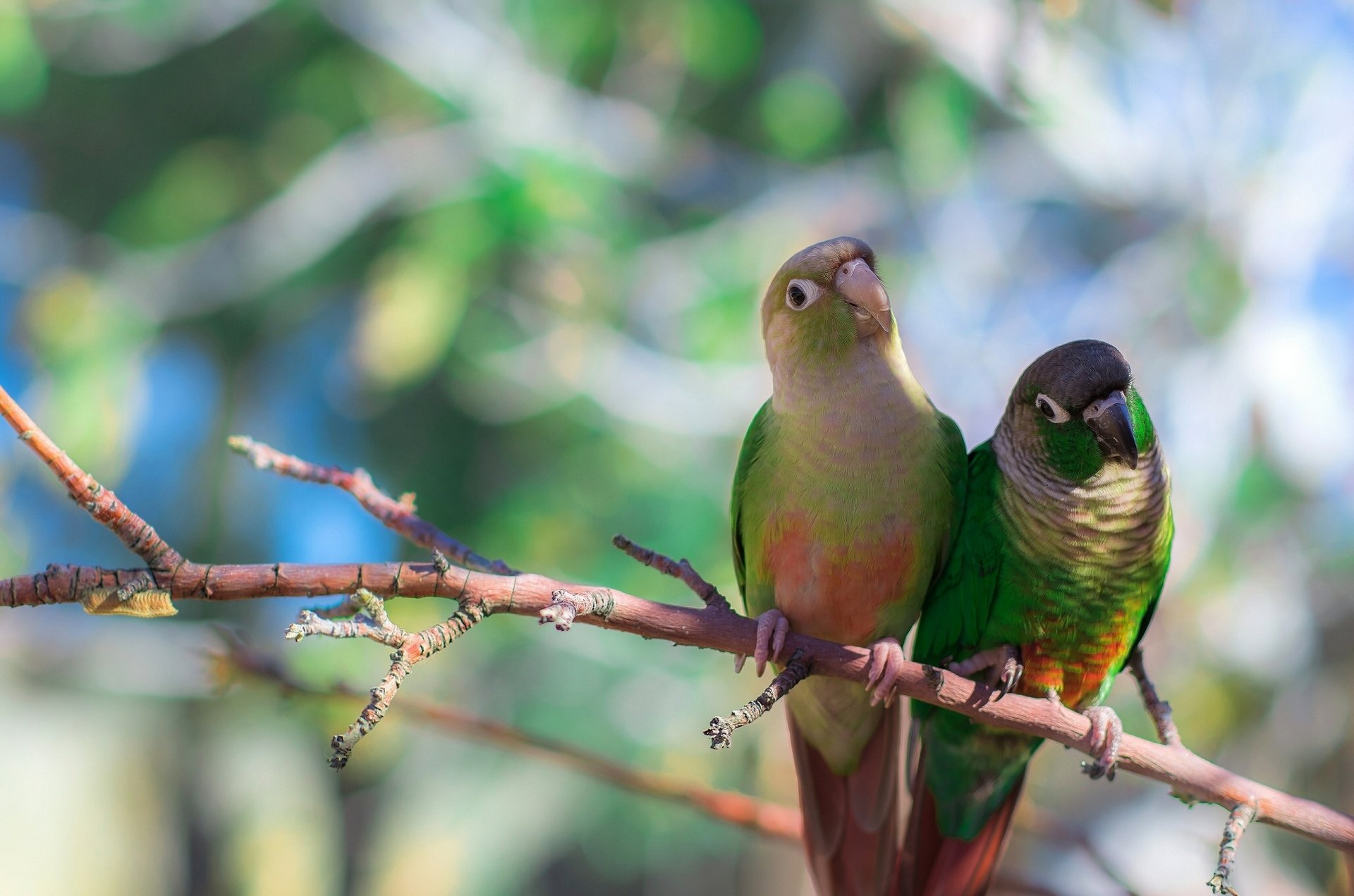 A pair of green-cheeked red-tailed parrots sitting on a branch